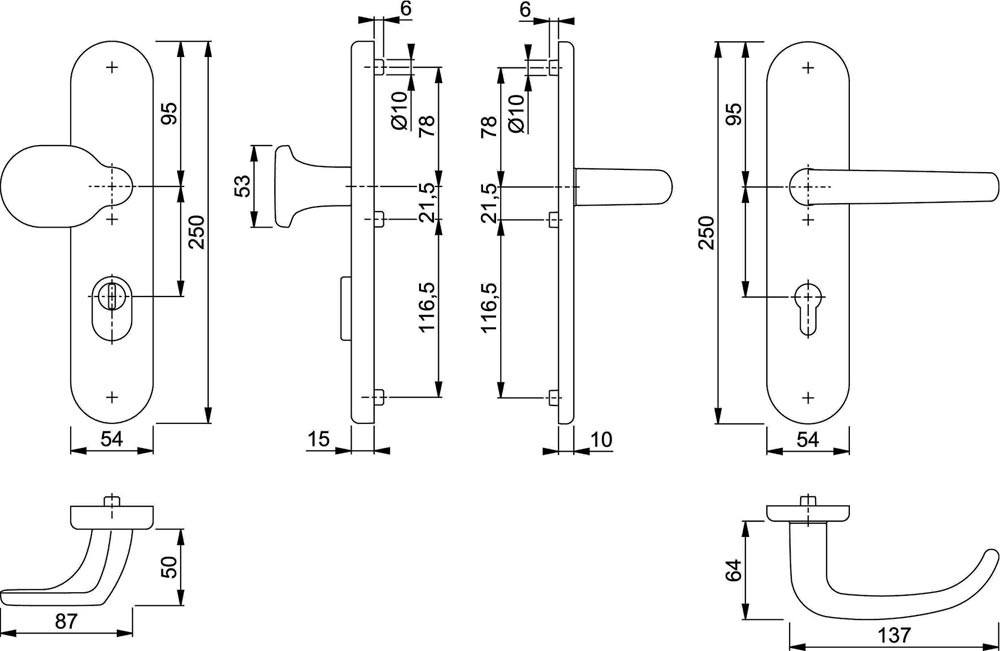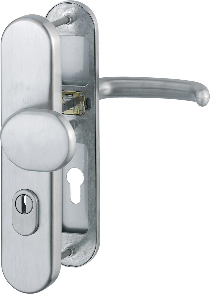 für Abschlusstüren · Stahl-Unterkonstruktion um Außen- und Zamak-Unterkonstruktion im Innenschild · außen: gekröpfter, feststehender Knopf · mit Rückholfeder · innen: loser Türgriff · Schnellstift-Verbindung (mit Hoppe FDW-Vollstift) · Zylinderabdeckung aus gehärtetem Stahl für vorstehende Zylinderlänge 10 - 18 mm · verdeckt, durchgehende Verschraubung · PZ · DIN links / rechts · Widerstandsklasse ES 1