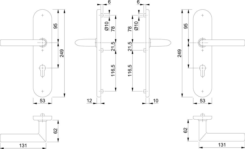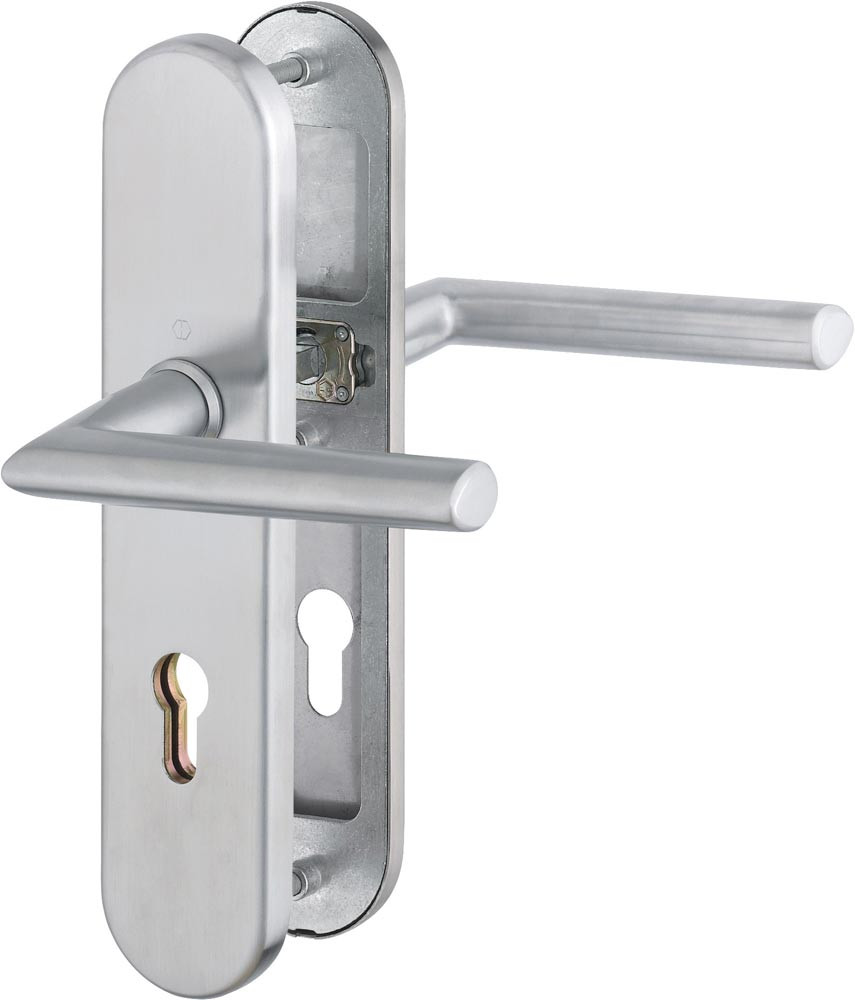 für Abschlusstüren · geprüft nach DIN 18257 · Stahl-Unterkonstruktion im Außen- und Innenschild mit Rückholfeder-Paket · Wechselgarnituren mit gekröpftem Knopf · feststehend (ummontierbar) · mit Schnellstift-Verbindung · hochfeste, verdeckte Verschraubung · Lochung PZ · einschließlich Befestigungsmaterial M 6 · DIN links / rechts · Widerstandsklasse ES 1