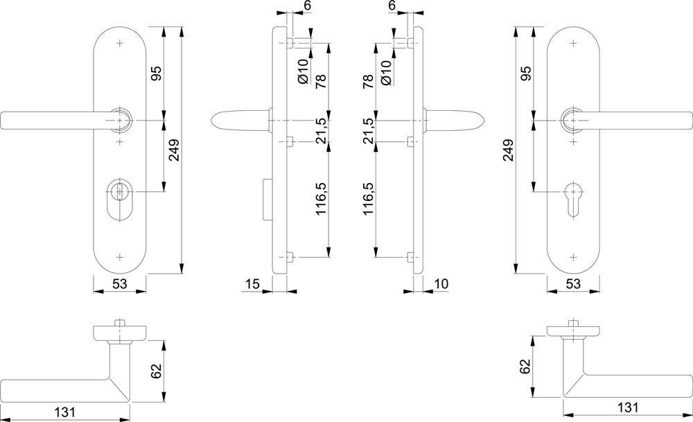 für Abschlusstüren mit ZA · geprüft nach DIN 18257 · Stahl-Unterkonstruktion im Außen- und Innenschild · mit Rückholfeder-Paket · Wechselgarnituren mit gekröpftem Knopf · feststehend (ummontierbar) · Zylinderabdeckung aus gehärtetem Stahl für vorstehende Zylinderlänge 10-18 mm · mit Schnellstift-Verbindung · hochfeste, verdeckte Verschraubung · Lochung PZ · einschließlich Befestigungsmaterial M 6 · DIN links / rechts · Widerstandsklasse ES 1