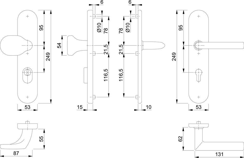 für Abschlusstüren mit ZA · geprüft nach DIN 18257 · Stahl-Unterkonstruktion im Außen- und Innenschild · mit Rückholfeder-Paket · Wechselgarnituren mit gekröpftem Knopf · feststehend (ummontierbar) · Zylinderabdeckung aus gehärtetem Stahl für vorstehende Zylinderlänge 10-18 mm · mit Schnellstift-Verbindung · hochfeste, verdeckte Verschraubung · Lochung PZ · einschließlich Befestigungsmaterial M 6 · DIN links / rechts · Widerstandsklasse ES 1