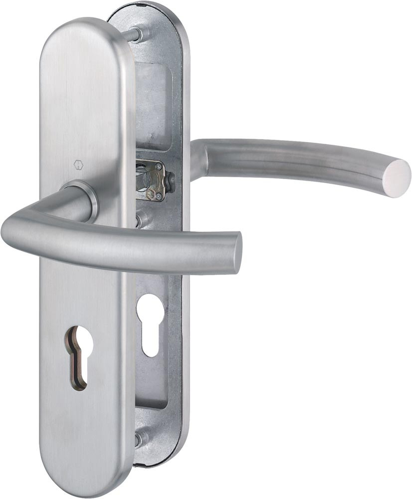 für Abschlusstüren · geprüft nach DIN 18257 · Stahl-Unterkonstruktion im Außen- und Innenschild · mit Rückholfeder-Paket · Wechselgarnituren mit gekröpftem Knopf · feststehend (ummontierbar) · mit Schnellstift-Verbindung · hochfeste, verdeckte Verschraubung · Lochung PZ · einschließlich Befestigungsmaterial M 6 · Anschlagrichtung DIN links / rechts · Widerstandsklasse ES 1