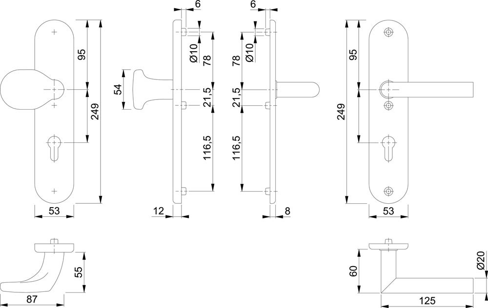 für Abschlusstüren · Zamak-Unterkonstruktion im Außen- und Innenschild · mit feststehendem Knopf · FDW-Profilstift-Verbindung · sichtbare Verschraubung · PZ · einschließlich Befestigungsmaterial M6 · Außenschild-Randhöhe 12 mm · Entfernung 72 mm · Vierkant 8 mm · DIN links / rechts · Widerstandsklasse ES 0
