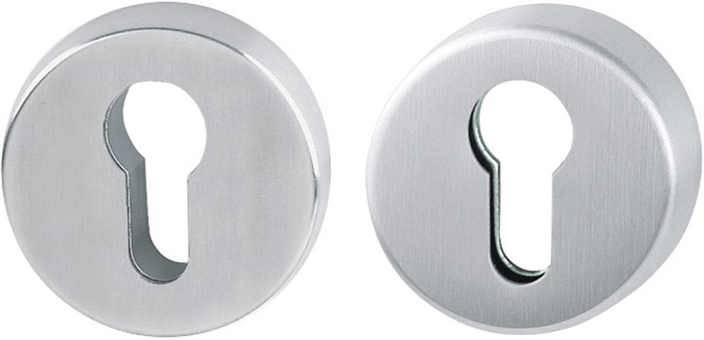 Edelstahl-Schutz-Schlüsselrosetten-Paar für Außentüren · Unterkonstruktion: außen Zamak, innen Stahl, Stütznocken · Befestigung: verdeckt, durchgehend, Gewindeschrauben M5 · Stärke 15 mm · Ø 55 mm · Lochung PZ · für Türstärke 57-62 mm + 67-72 mm