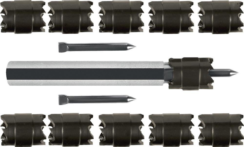 Inhalt: 1 Schweißpunktfräser, komplett, 10 Fräskronen, 2 Zentierstifte