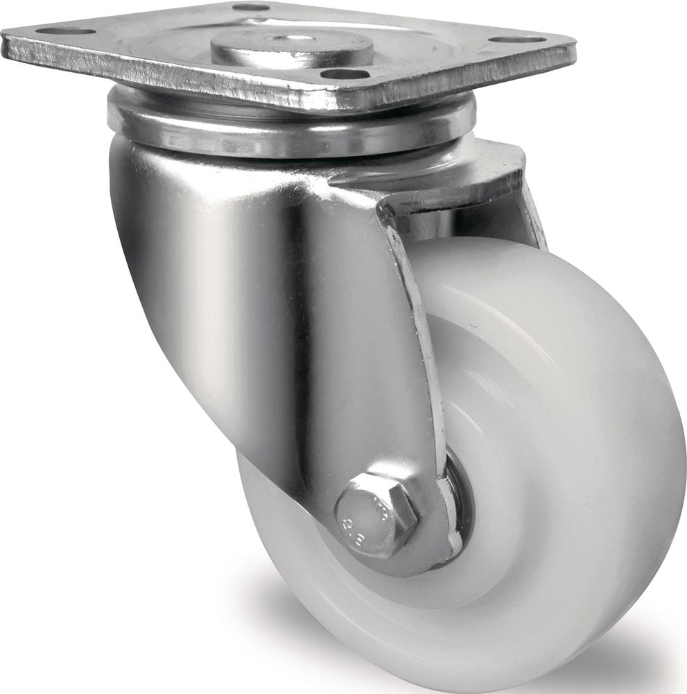 galvanisch blau verzinktes Stahlblechgehäuse · Gehäuse mit Materialstärke 6 mm (Befestigung) und 5 mm (Gabel) · Radkörper aus Polyamid · Lauffläche Polyamid PA6 weiß · Doppelkugellager · verschraubte Radachse · mit Plattenbefestigung