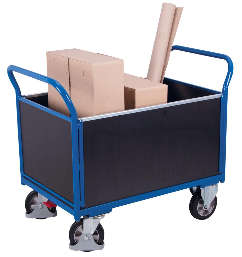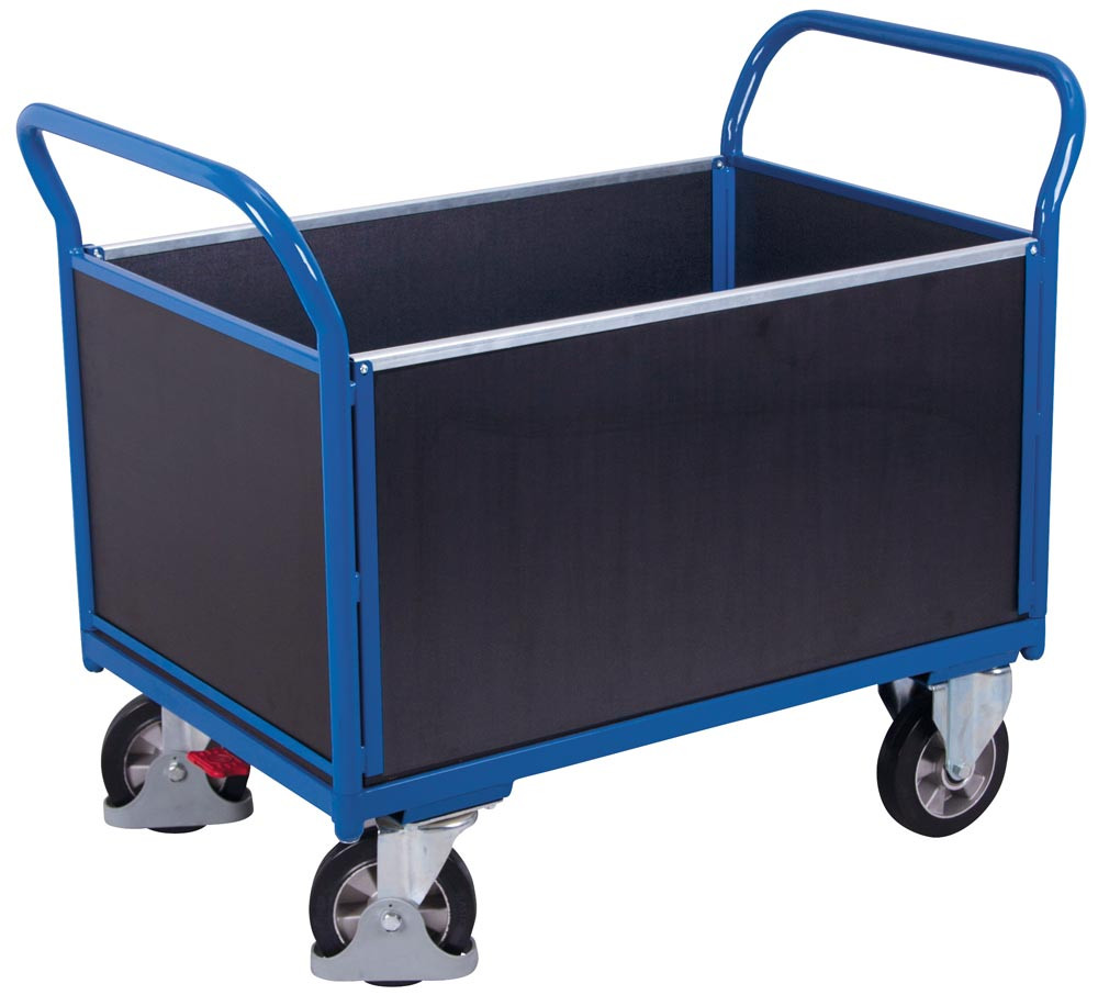 ∙ Schweißkonstruktion aus Stahlrohr und innovativem Rahmenprofil ∙ Pulverbeschichtet RAL 5010 enzianblau ∙ Schlag- und kratzfest ∙ Ladefläche und Wände aus wasserfest verleimtem Sperrholz mit rutschhemmender Siebdruckoberfläche ∙ Stirnwandhöhe 500 mm ∙ Längswände herausnehmbar · Lenkrollen gemäß EN 1757-3 mit zentraler Fußbremse EasySTOP und Fußschutz · Elastik-Vollgummi-Bereifung auf Alu-Druckgussfelge mit Fußschutz · Naben mit Kugellager