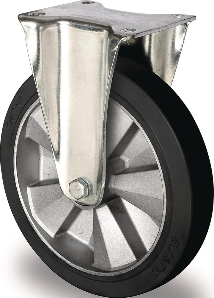 stabiles Stahlblechgehäuse, verzinkt chromatiert · Bockrolle · Elastik-Vollgummireifen (schwarz, fest aufvulkanisiert) auf Aluminium-Radkörper · Radachse verschraubt · Kugellager · mit Plattenbefestigung