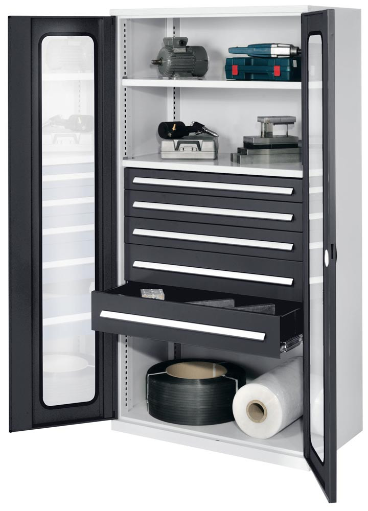 Schwerlastschrank, 2 Böden, Schubl.:, 1x100, 2x125, 2x175 mm, BxTxH 1000x600x1950 mm, RAL 7035/7016