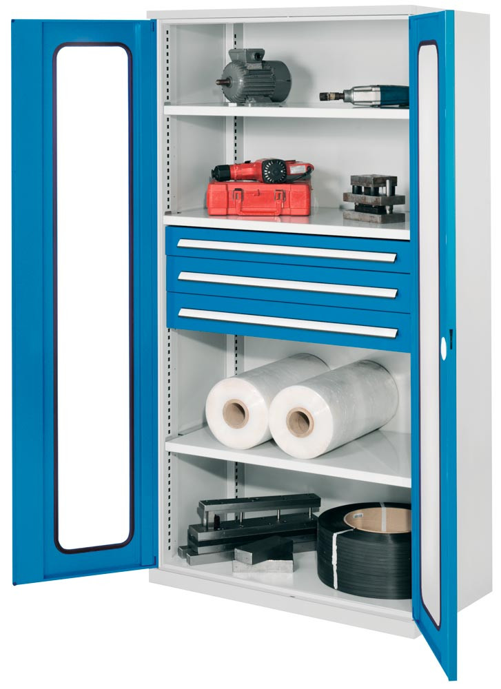 Schwerlastschrank, Sichtfenstertüren, 3 Fachböden, Schubl. 1x100, 2x125 mm, BxTxH 1000x600x1950 mm, RAL 7035/5010