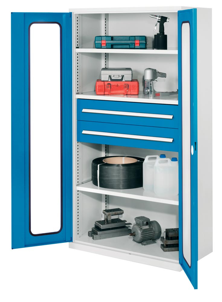 Schwerlastschrank, Sichtfenstertüren, 3 Fachböden, Schubl. 2x175 mm, BxTxH 1000x600x1950 mm, RAL 7035/5010