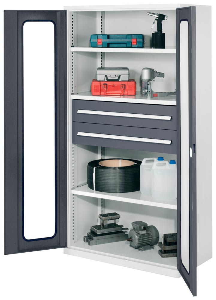 Schwerlastschrank, Sichtfenstertüren, 3 Fachböden, Schubl. 2x175 mm, BxTxH 1000x600x1950 mm, RAL 7035/7016