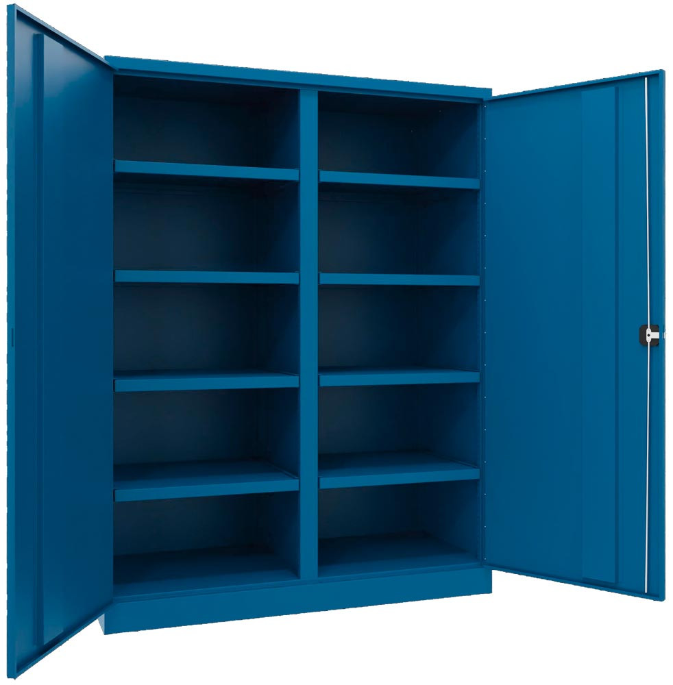 Schwerlastschrank, Vollblechtüren, m. Trennwand, 8 Böden, 200 kg Traglast, BxTxH 1470x630x1950 mm, RAL 5010 E6490107