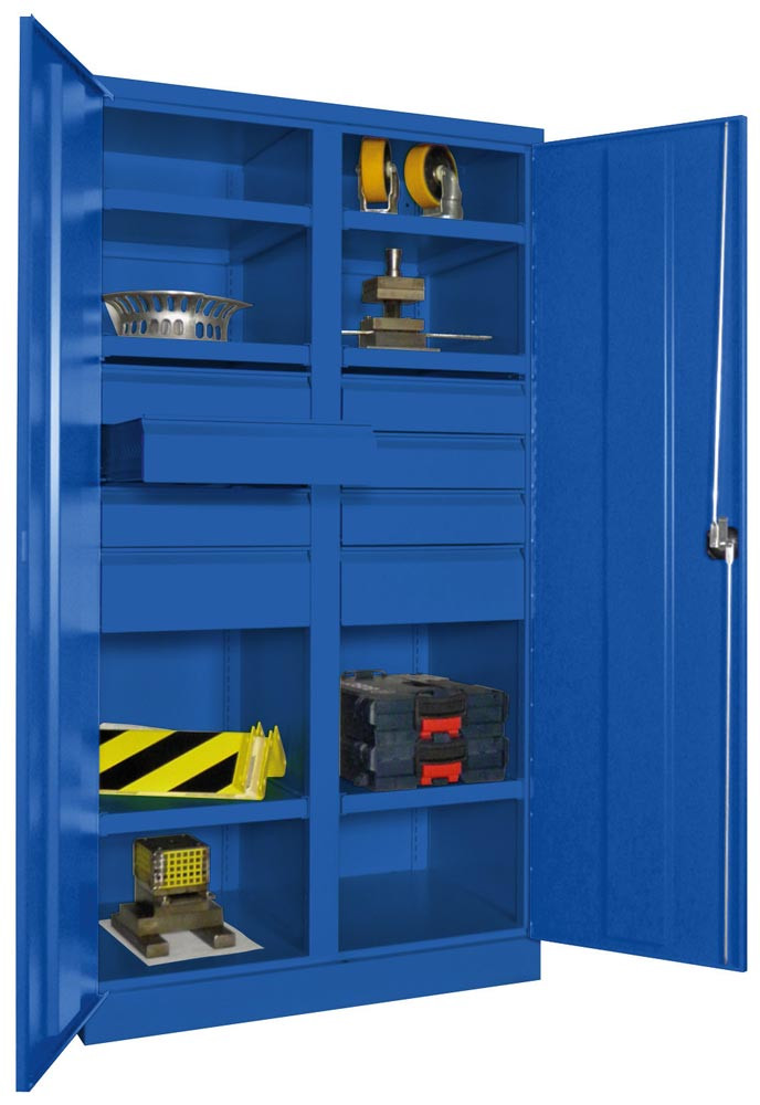 ∙ Besonders stabile, verwindungssteife Stahlblechkonstruktion ∙ Oberfläche pulverbeschichtet ∙ Schränke mit gemeinsam verschließbaren Flügeltüren mit Verstärkungstaschen ∙ Die Türen sind über einen dreiriegeligen Drehgriff mit integriertem Zylinderschloss inkl. 2 Schlüsseln verschließbar ∙ Türöffnung 180 ° ∙ Belastbarkeit je Boden 120 kg bzw. 200 kg, je Schublade 60 kg bei gleichmäßig verteilter Last ∙ Gehäuse-Belastbarkeit 1300 kg ∙ Einrichtungselemente im Raster von