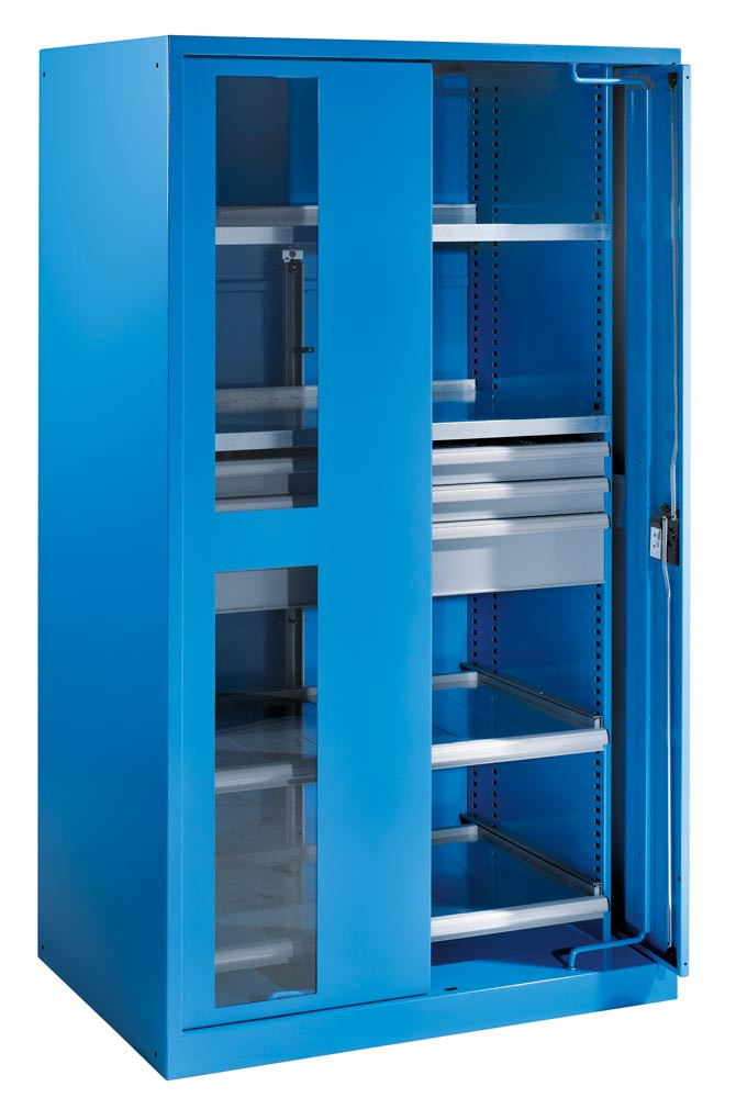 Schwerlastschrank mit Einschwenktüren und Sichtscheiben, Zylinderschloss, 3 Schubladen, 2 Auszugböden, BxTxH 1146x690x1950 mm, RAL 5012 E1615214