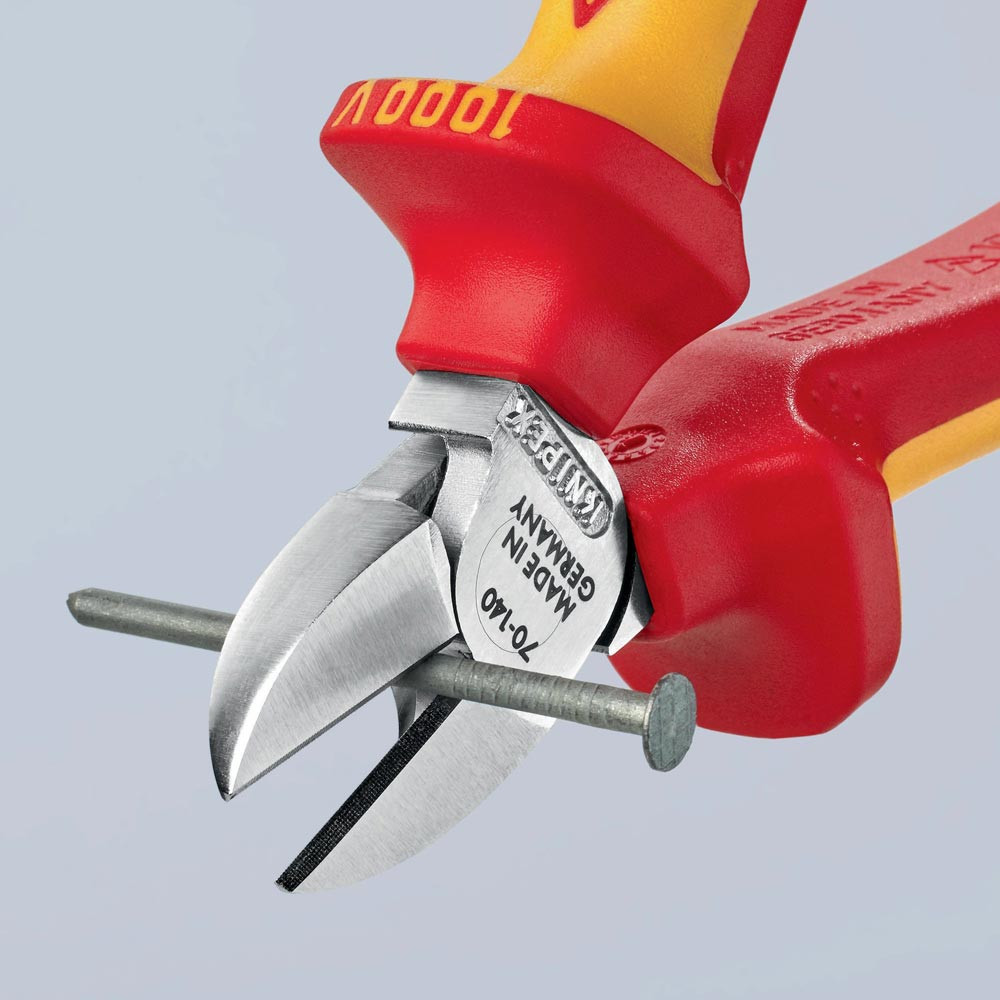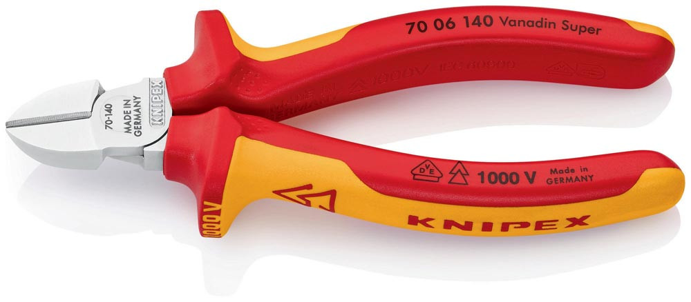 VDE-isoliert bis 1000 V · gefertigt gem. DIN EN/IEC 60900, stückgeprüft · schlanke Kopfform · sauberer Schnitt bei dünnen Cu-Drähten, auch an den Schneidenspitzen · Schneiden zusätzlich gehärtet, Schneidenhärte ca. 62 HRC · Vanadin-Elektrostahl, geschmiedet, mehrstufig ölgehärtet