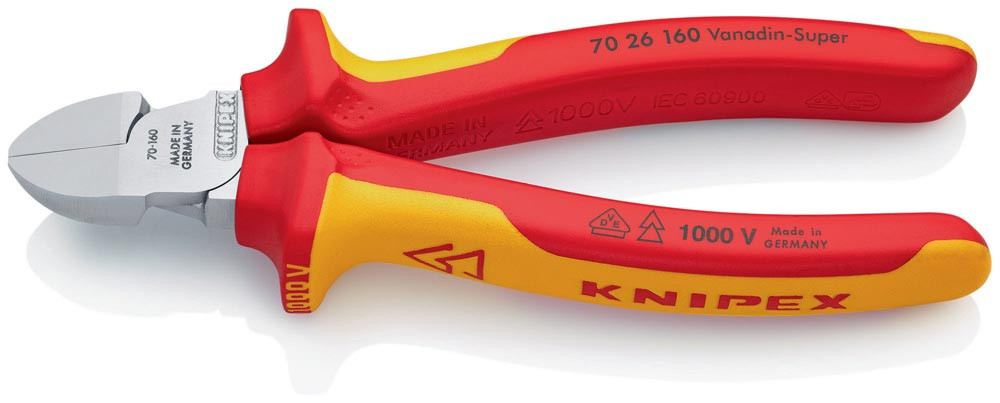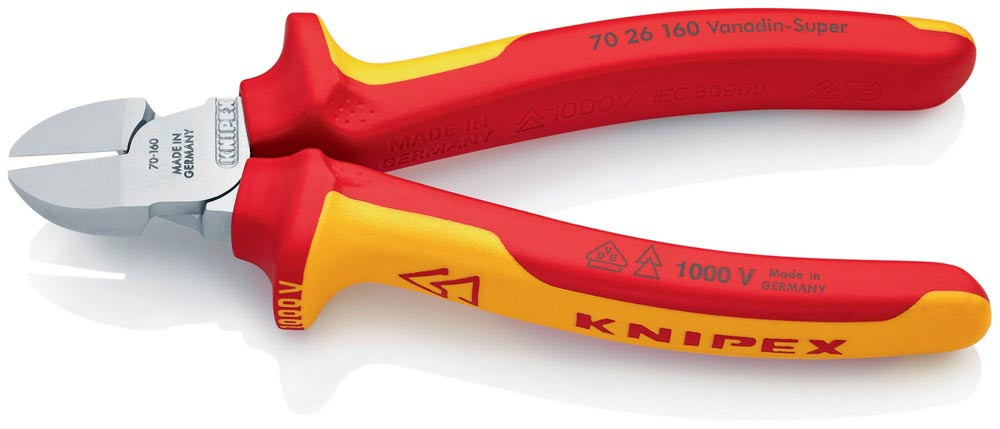 VDE-isoliert bis 1000 V · gefertigt gem. DIN EN/IEC 60900, stückgeprüft · schlanke Kopfform · sauberer Schnitt bei dünnen Cu-Drähten, auch an den Schneidenspitzen · Schneiden zusätzlich gehärtet, Schneidenhärte ca. 62 HRC · Vanadin-Elektrostahl, geschmiedet, mehrstufig ölgehärtet