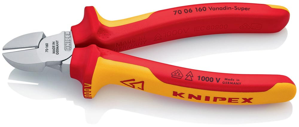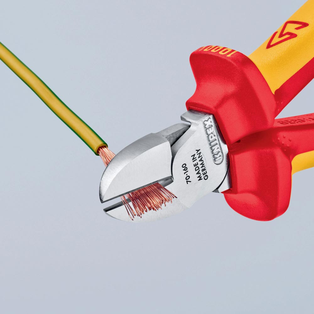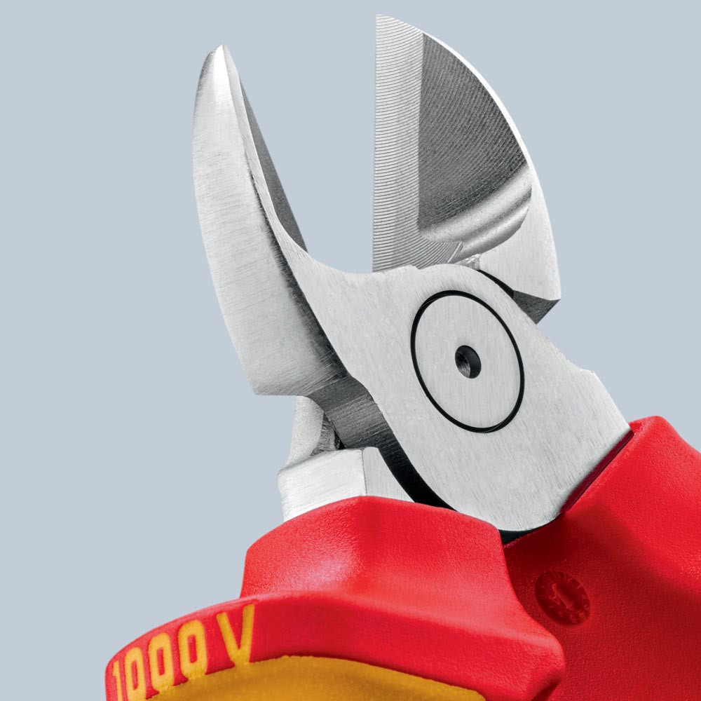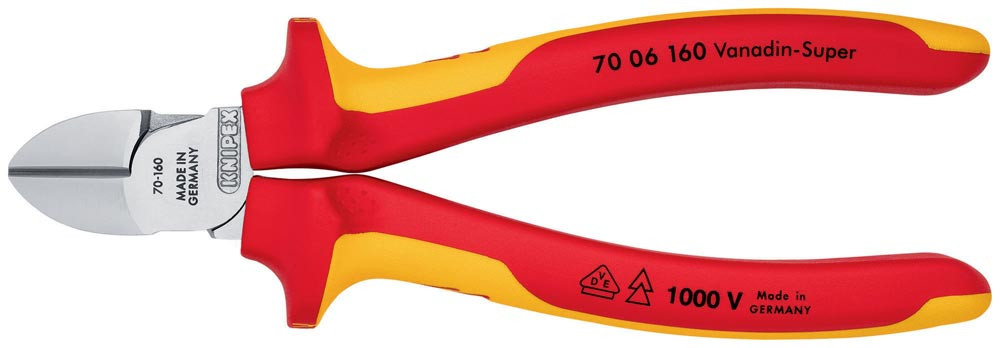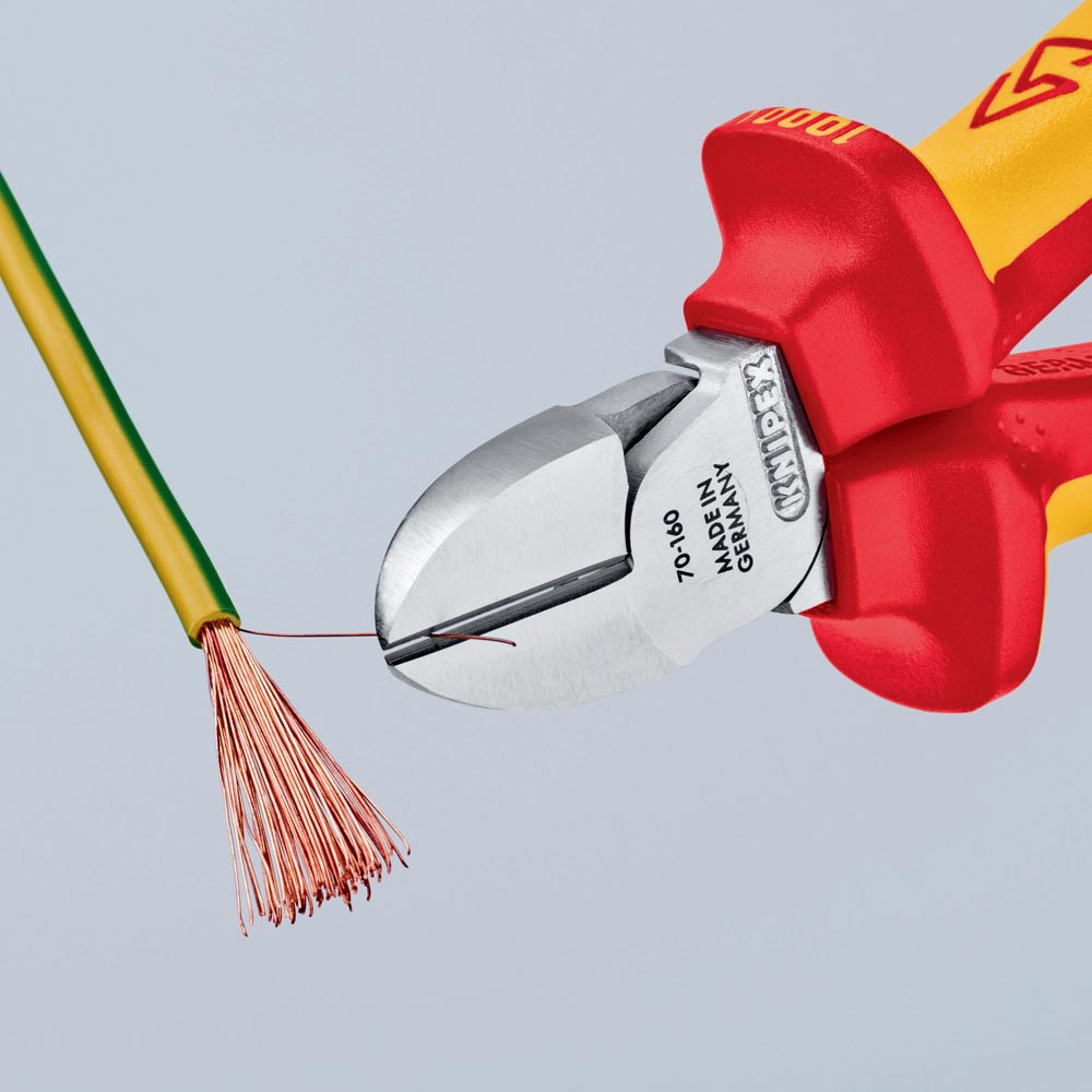 VDE-isoliert bis 1000 V · gefertigt gem. DIN EN/IEC 60900, stückgeprüft · schlanke Kopfform · sauberer Schnitt bei dünnen Cu-Drähten, auch an den Schneidenspitzen · Schneiden zusätzlich gehärtet, Schneidenhärte ca. 62 HRC · Vanadin-Elektrostahl, geschmiedet, mehrstufig ölgehärtet