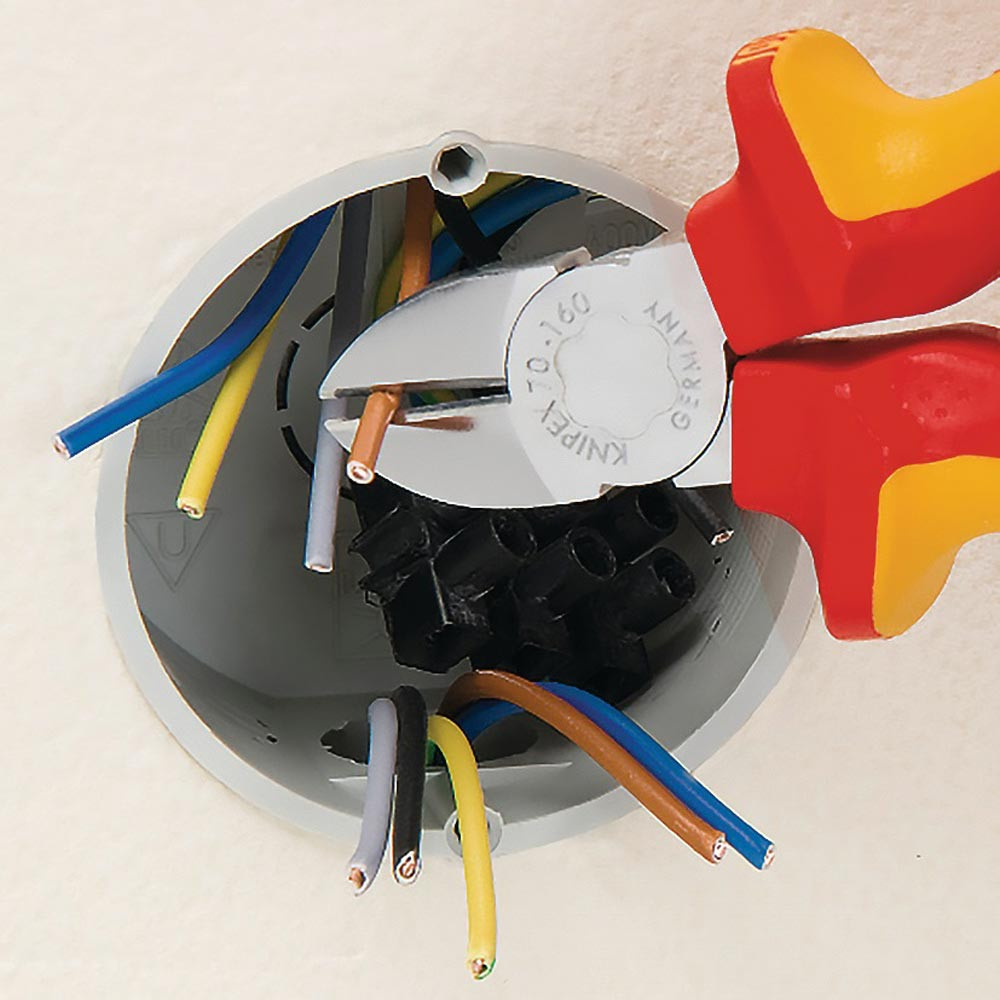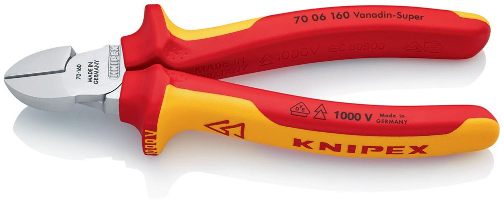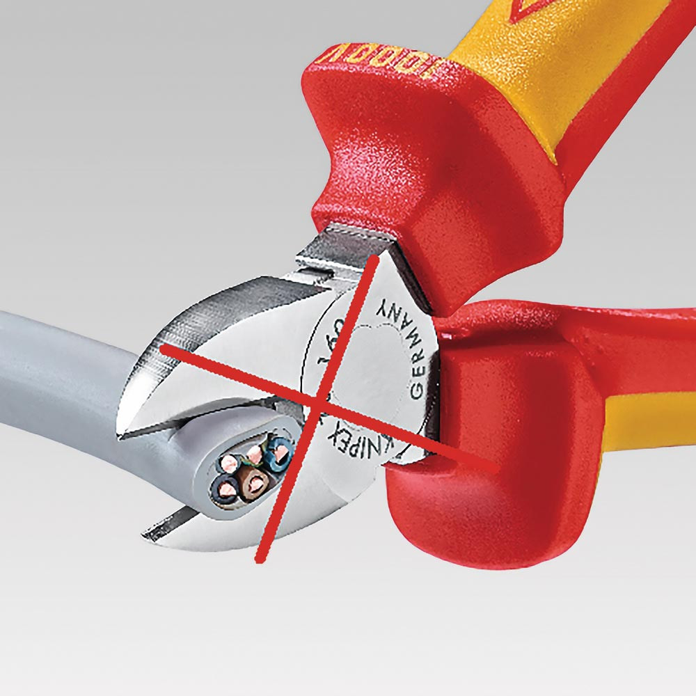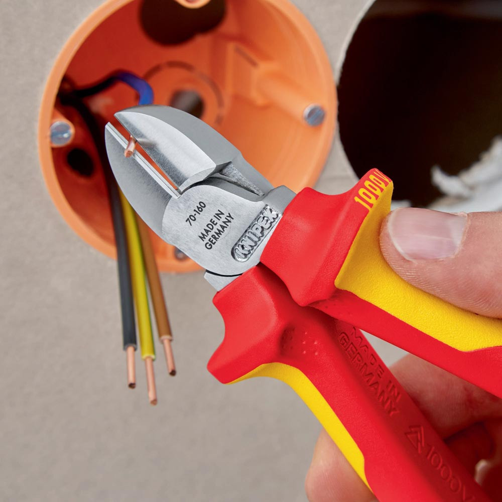 VDE-isoliert bis 1000 V · gefertigt gem. DIN EN/IEC 60900, stückgeprüft · schlanke Kopfform · sauberer Schnitt bei dünnen Cu-Drähten, auch an den Schneidenspitzen · Schneiden zusätzlich gehärtet, Schneidenhärte ca. 62 HRC · Vanadin-Elektrostahl, geschmiedet, mehrstufig ölgehärtet