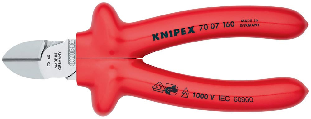 VDE-isoliert bis 1000 V · gefertigt gem. DIN EN/IEC 60900, stückgeprüft · schlanke Kopfform · sauberer Schnitt bei dünnen Cu-Drähten, auch an den Schneidenspitzen · Schneiden zusätzlich gehärtet, Schneidenhärte ca. 62 HRC · Vanadin-Elektrostahl, geschmiedet, mehrstufig ölgehärtet