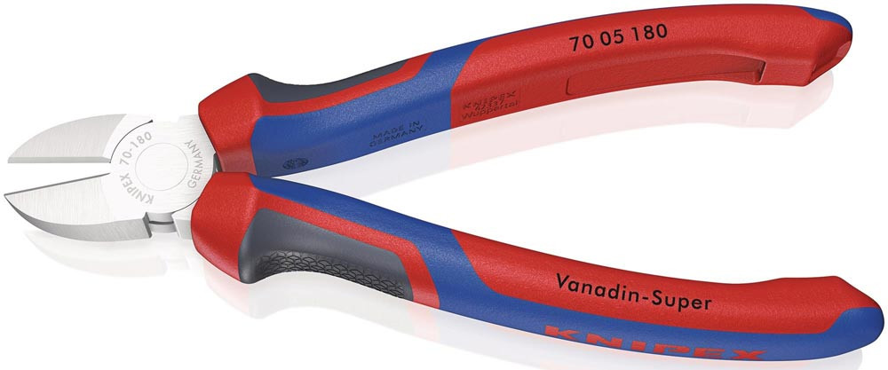 schlanke Kopfform · sauberer Schnitt bei dünnen Cu-Drähten, auch an den Schneidenspitzen · Schneiden zusätzlich gehärtet, Schneidenhärte ca. 62 HRC · Vanadin-Elektrostahl, geschmiedet, mehrstufig ölgehärtet
