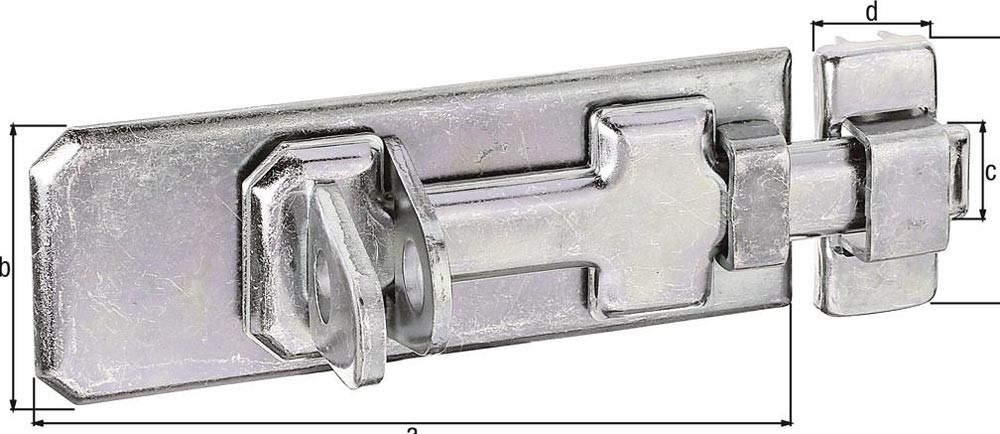 mit flachem Griff bei vorgeschobenem Schieber sind die versenkten Schraublöcher der Riegelplatte abgedeckt, so dass ein Abschrauben unmöglich ist · die Schlaufe ist durch eine Einschlaglasche gesichert, die durch den vorgeschobenen Schieber verdeckt wird · Material: Stahl, Oberfläche: galvanisch verzinkt, dickschichtpassiviert mit befestigter Schlaufe · Aufgrund von Umstellungen der Oberfläche kann dieser Artikel in unterschiedlichen Ausführungen (gelb-verzinkt, sendzimirverzinkt oder verzinkt-dickschicktpassiviert) geliefert werden.