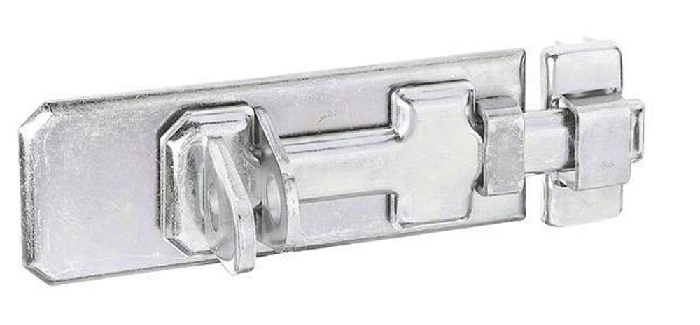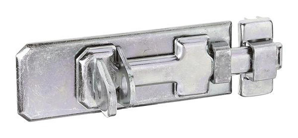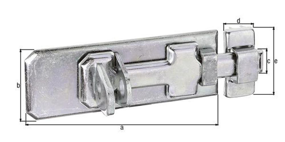 mit flachem Griff bei vorgeschobenem Schieber sind die versenkten Schraublöcher der Riegelplatte abgedeckt, so dass ein Abschrauben unmöglich ist · die Schlaufe ist durch eine Einschlaglasche gesichert, die durch den vorgeschobenen Schieber verdeckt wird · Material: Stahl, Oberfläche: galvanisch verzinkt, dickschichtpassiviert mit befestigter Schlaufe · Aufgrund von Umstellungen der Oberfläche kann dieser Artikel in unterschiedlichen Ausführungen (gelb-verzinkt, sendzimirverzinkt oder verzinkt-dickschicktpassiviert) geliefert werden.