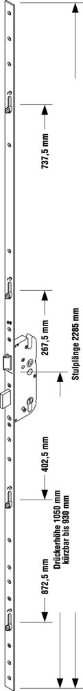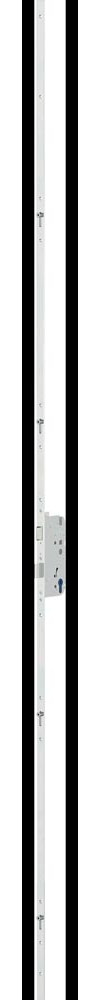 Mehrfachverriegelung mit Rollzapfen · die einstellbaren Rollzapfen optimieren den Flügelandruck im oberen und unteren Bereich der Türen und sorgen so für einen hohen Wärme- und Schallschutz. In Kombination mit z. B. Massivriegel (MR/R) wird ein zusätzlich verbesserter Einbruchschutz realisiert. Schlosskasten allseitig geschlossen geprüft nach DIN 18251 Klasse 3/4. Durchgangsbohrungen für Rosetten mit Späneschutz. Falle umstellbar von DIN LS auf DIN RS. Schlossriegel 2-tourig (=20 mm Riegelausschluss). Stulp eckig silberfarbig verzinkt 2285 mm.