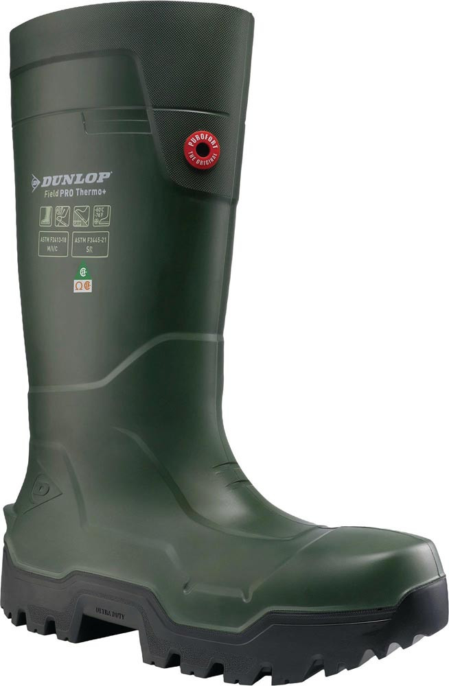 nach DIN EN ISO 20345:2022 · S5L CI CR SR FO LG · mit Zehenschutzkappe und Zwischensohle aus Verbundwerkstoff · aus geschäumtem Polyurethan · starker und langlebiger Purofort-Stiefel für unterschiedliche Bereiche in der Landwirtschaft · das leichte Purofort sorgt dafür, dass die Füße nicht ermüden · hält die Füße bei Kälte warm und bei Wärme kühl · herausragende thermische Isolierung bis -60 °C durch Purofort-Materialtechnologie · Einlegesohle: Dunlop Comfort Insoles PRO series · SR-zertifizierte Außensohle für maximalen Halt trotz härtester Bedingungen · Laufsohlen-Abnutzungsindikator zur Überwachung des Sohlenabriebs