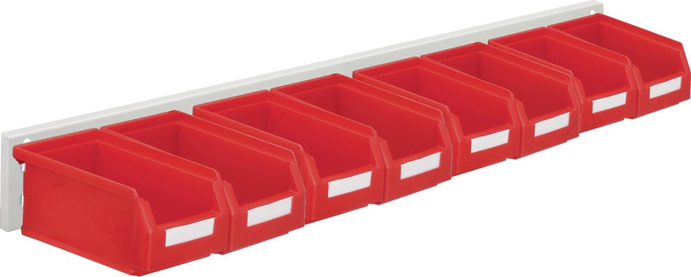 bestehend aus: Wandschiene B 920 mm mit Schlitzplatte, Stahlblech lichtgrau, RAL 7035 und Sichtlagerkästen, inkl. Etiketten