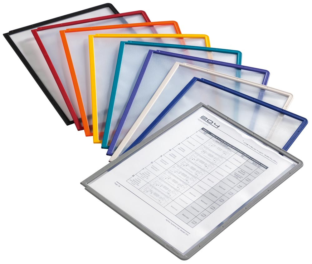 ∙ Aus Polypropylen · Mit farbigem Profilrahmen ∙ Format DIN A4 ∙ Reflektionsarme Folie, dokumentenecht, scannertauglich · Geeignet zum Einsatz in Sichttafelsystemen oder auch ohne Tafelhalter für Aushänge ∙ VE 10 Stück