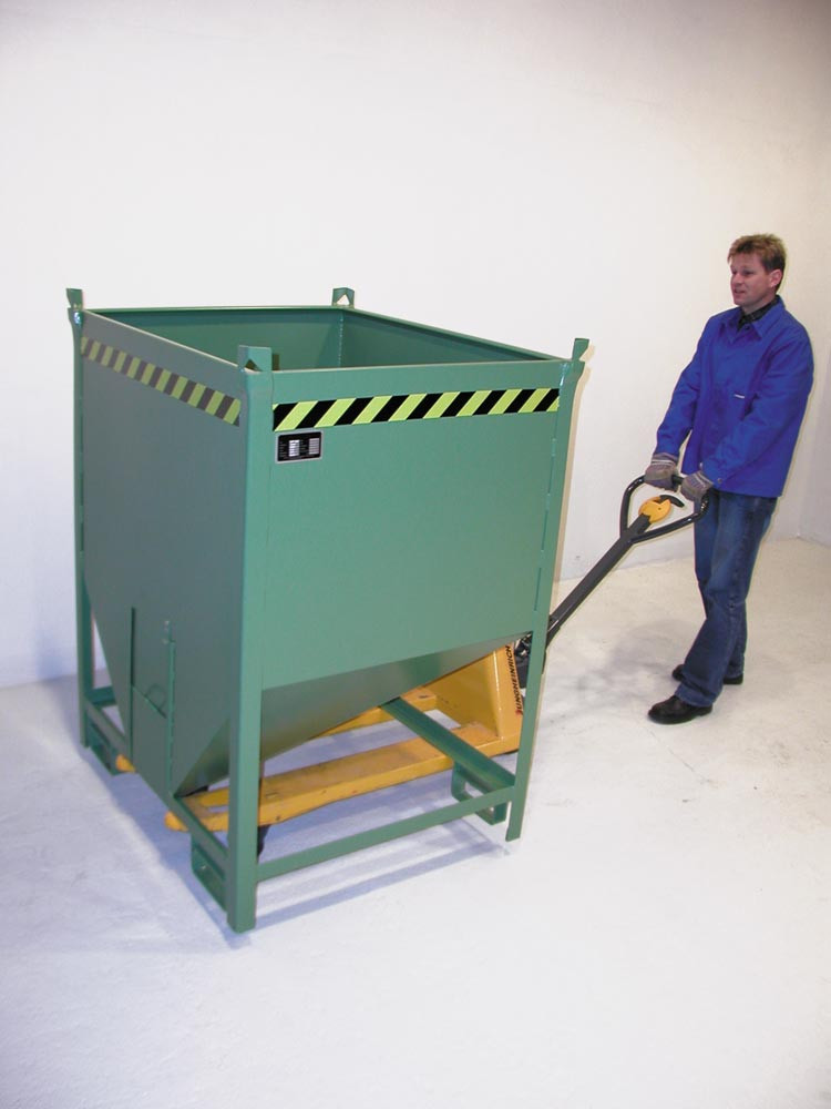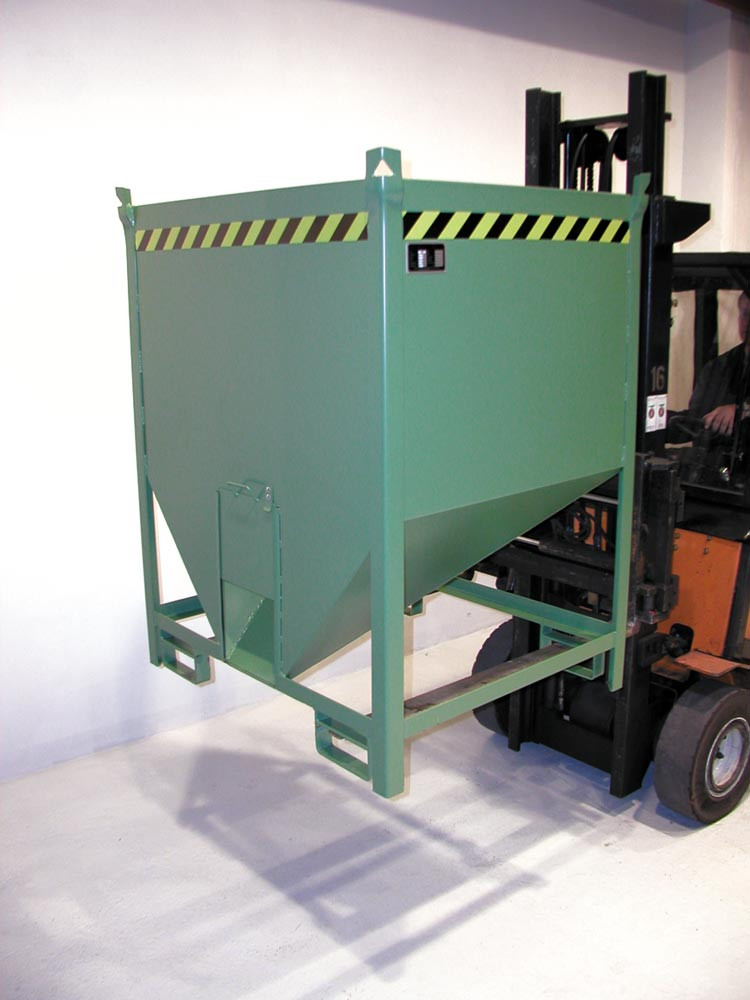 ∙ Für die getrennte Sammlung und Entleerung von Schüttgütern ∙ 3-fach stapelbar ∙ Robuste Stahlblechkonstruktion ∙ Trichter aus 2 mm Stahlblech mit umlaufender Verstärkung ∙ Bodenschräge 30° ∙ Grundrahmen mit Einfahrbügeln ∙ Aufnahmen für Gabelstapler und Kran ∙ Auch mit Gabelhubwagen transportierbar