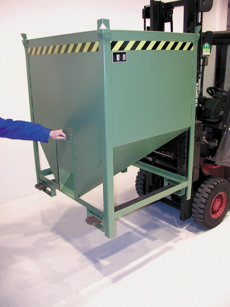 Silobehälter, LxBxH 1000x1200x1260 mm, Vol. 0,75 cbm, Traglast 1000 kg, stirnseitiger Schieberverschluss, lackiert RAL 6011 resedagrün
