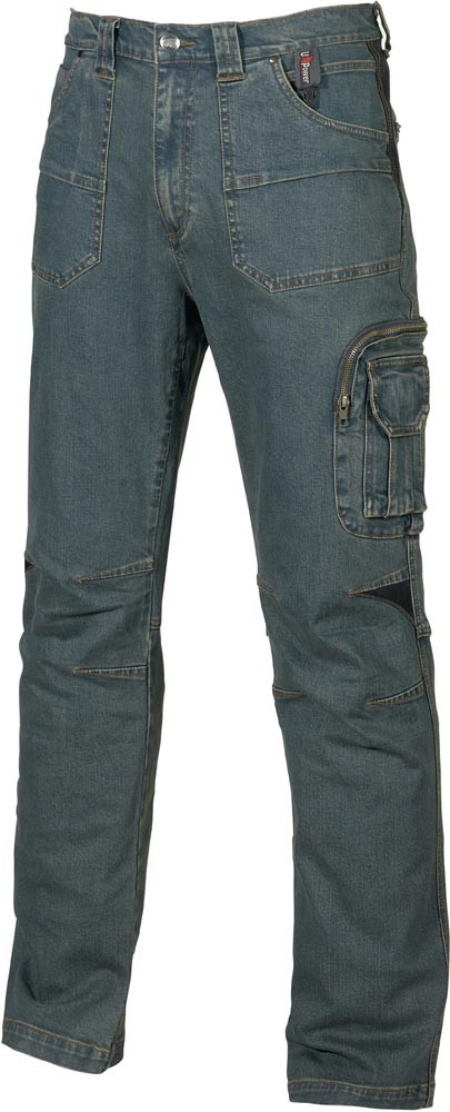70% Baumwolle / 27% Polyester / 3% Elastan, ca. 330 g/m² · 3-fach Nähte · multifunktionale Seitentasche mit Handytasche · Ausweisfach · 2 Free-Pocket Taschen mit Sicherheitsreißverschluss · Stretcheinsätze im Kniebereich · Bundregulierung durch Klettverschlüsse · mit Schlüsselschlaufe