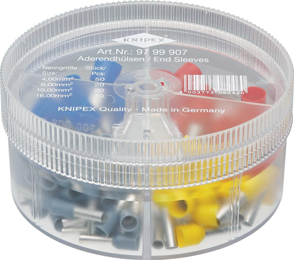 Lieferumfang: 1 x KNIPEX Aderendhülsen grau 17 mm (50 x 4 mm² / AWG 11) · 1 x KNIPEX Aderendhülsen gelb 20 mm (20 x 6 mm² / AWG 10) · 1 x KNIPEX Aderendhülsen rot 22 mm (20 x 10 mm² / AWG 7) · 1 x KNIPEX Aderendhülsen blau 24 mm (10 x 16 mm² / AWG 5)