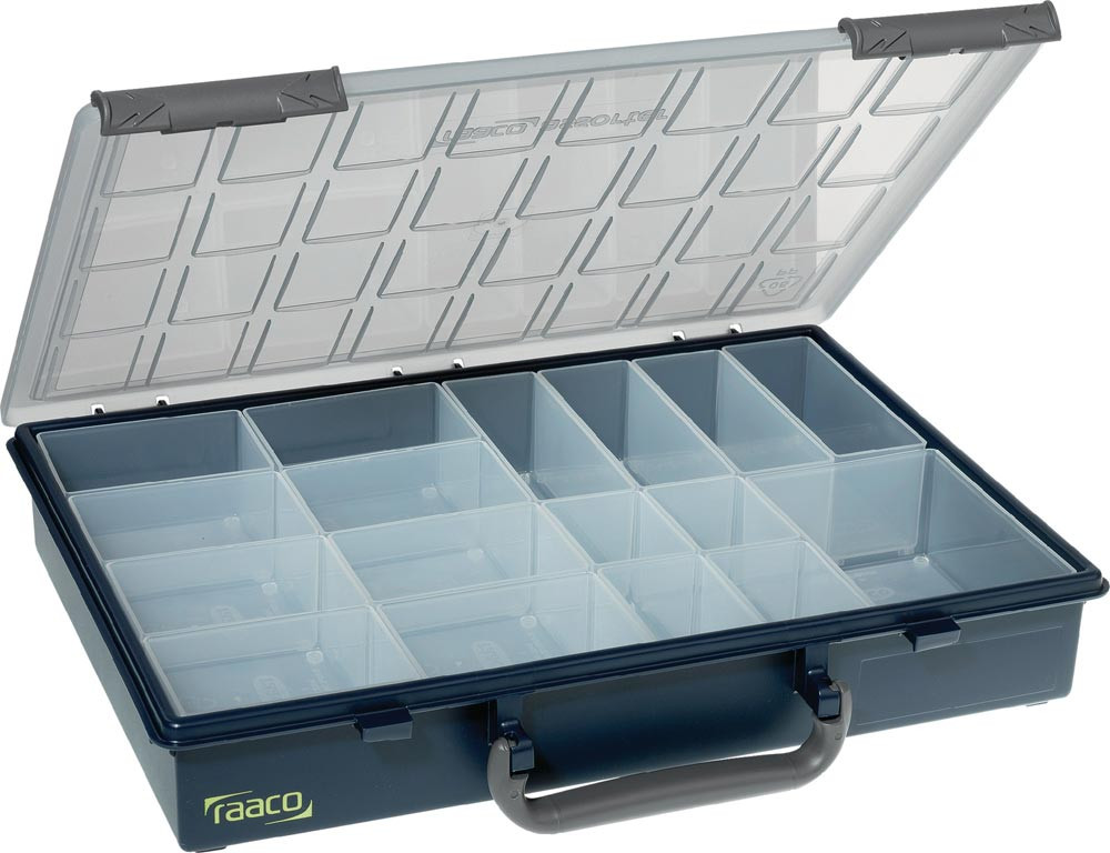 aus schlagfestem Polypropylen · mit stabilem U-Profil-Deckel und ergonomisch geformten Tragegriff · 3 starke Scharniere · Schiebeverschlüsse · der Innenraum kann durch die mitgelieferten herausnehmbaren Fach-Einsätze nach Bedarf unterteilt werden · Fach-Einsätze: