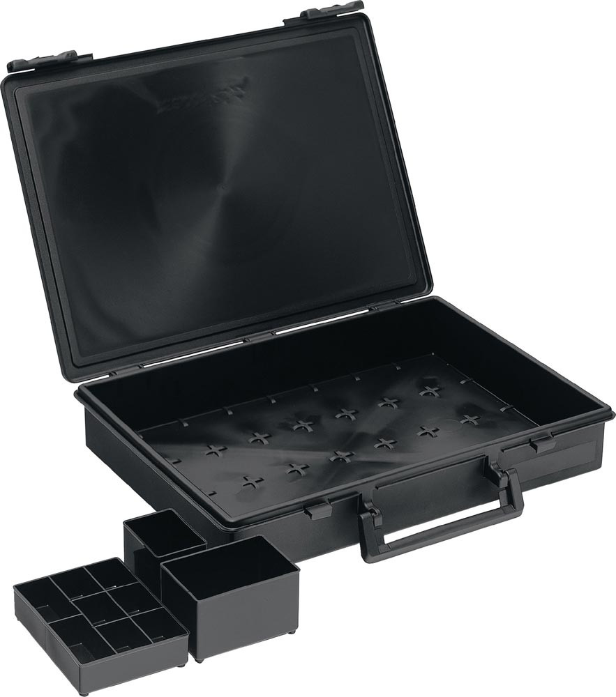 leer · kann durch Einsätze in verschiedenen Größen unterteilt werden · inkl. Schiebeverschlüssen und Tragegriff · Rastersysteme im Deckel und Boden verhindern ein Verrutschen des Inhalts · Farbe schwarz · hergestellt aus ESD-PP