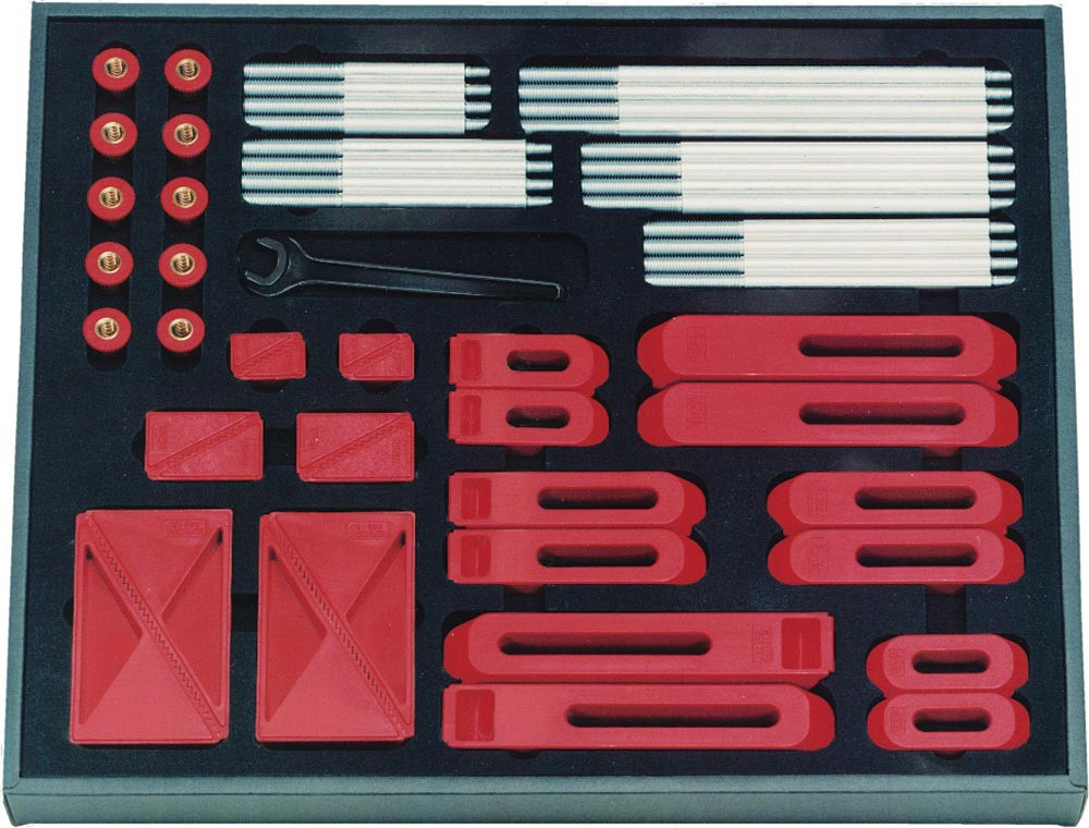 bestehend aus 55 Elementen · Spannpratzen, -unterlagen und Muttern aus hochfestem Kunststoff PBT, rot · Stiftschrauben: Aluminium eloxiert