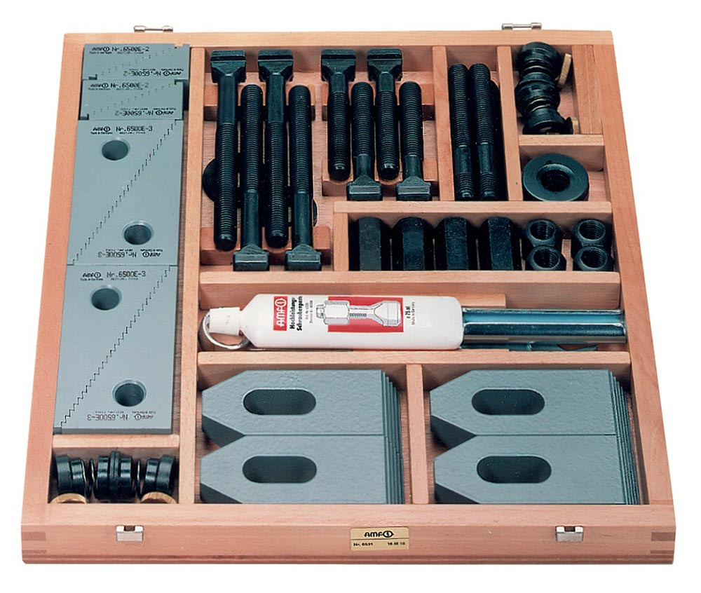 mit federndem Spanneisenhalter · enthält alle notwendigen Elemente zum schnellen Aufspannen von Werkzeugen, Vorrichtungen oder Werkstücken auf T-Nutentischen · alle Teile sind aus Vergütungsstahl, sie sind auswechselbar und können jederzeit ersetzt werden · die Lieferung erfolgt im Holzkasten mit abnehmbarem Klappdeckel