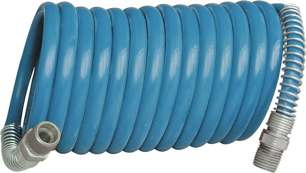 Polyamid · Schläuche beidseitig komplett eingebunden mit drehbaren Anschlussgewinden in Messing verzinkt · ohne Querschnittsverengungen · knickfest durch Knickschutzfeder · Temperaturbereich: -40 °C bis +100 °C · Farbe blau