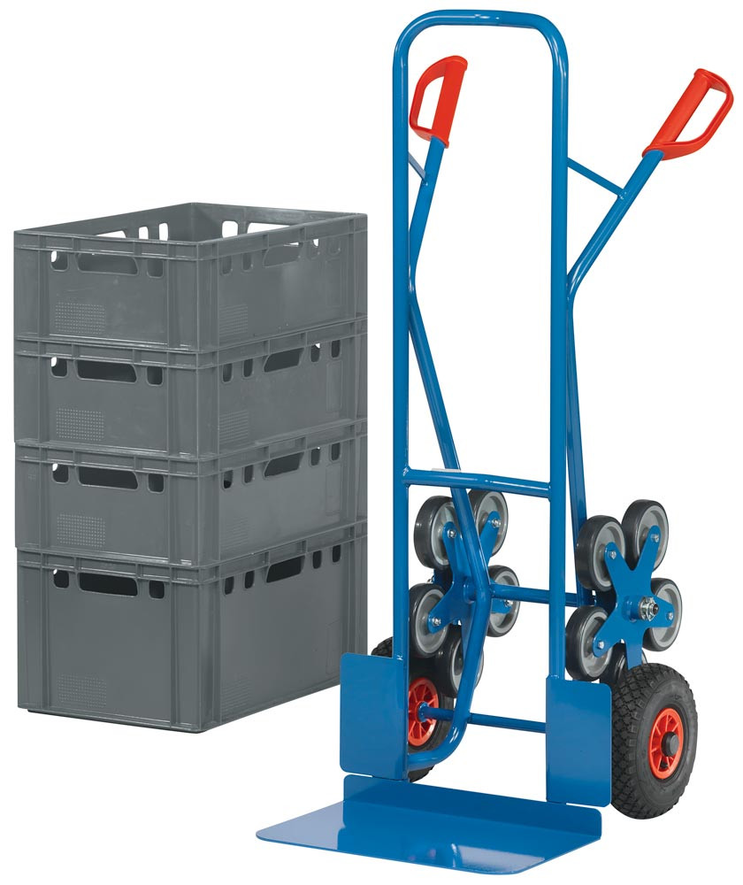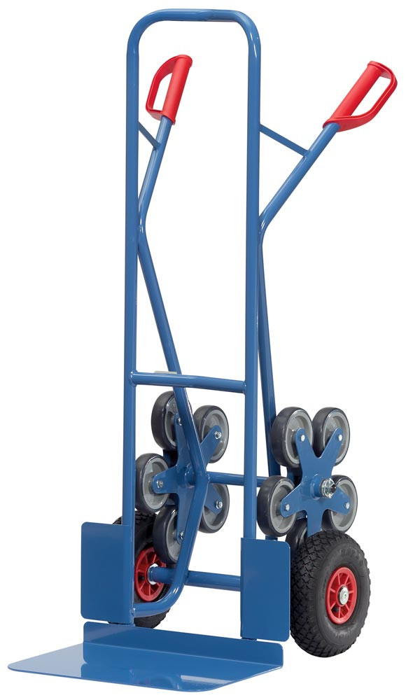 Stahlrohr-Treppenkarre, Schaufel-BxT 480x300 mm, HxB 1300x590 mm, Traglast 200 kg, 2 Räder Luftbereifung + 2 fünfarmige Radsterne, RAL 5007 blau