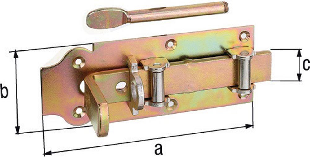 mit flachem Griff · der rückseitig eingeschraubte Stift erlaubt ein Öffnen des Tores von innen · Material: Stahl, Oberfläche: galvanisch gelb verzinkt · Ausführung: gerade, mit befestigter Schlaufe · Aufgrund von Umstellungen der Oberfläche kann dieser Artikel in unterschiedlichen Ausführungen (gelb-verzinkt, sendzimirverzinkt oder verzinkt-dickschicktpassiviert) geliefert werden.