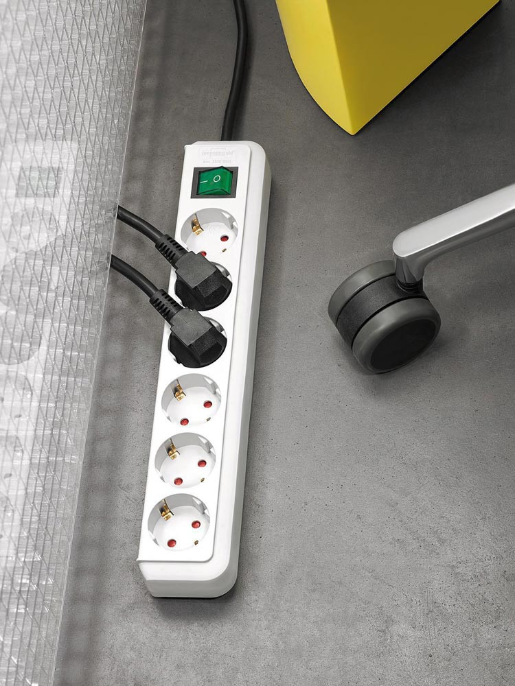 mit Schutzkontaktsteckdosen und beleuchtetem Kontrollschalter (2-polig) · quersitzende Steckdosentöpfe für den komfortablen Einsatz von Winkelsteckern · Steckdosen mit Kinderschutz · bruchsicheres Gehäuse aus hochwertigem Kunststoff · stabile Kontakte