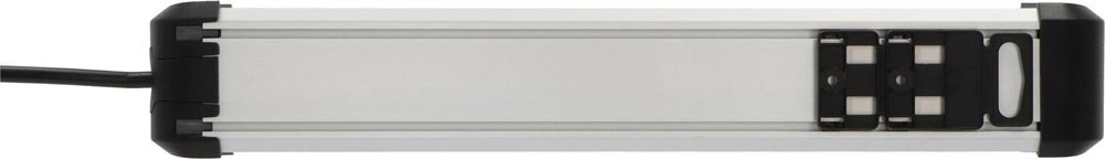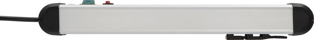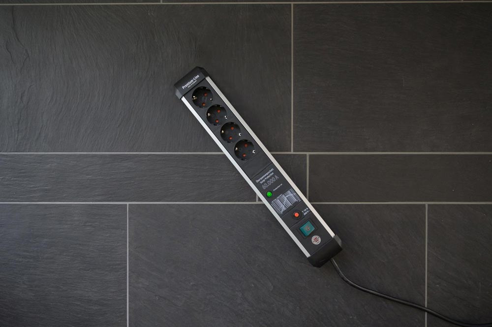 silber/schwarz · schützt wertvolle Geräte vor Überspannungen mit einem max. Ableitstrom bis zu 60.000 A · Sicherheitsschalter beleuchtet, zweipolig ein-/ausschaltbar · Steckdosen mit erhöhtem Berührungsschutz in praktischer 45°-Anordnung · Gesamtleistung max. 16 A/3500 W · Kabelbezeichnung H05VV-F 3G1,5 · Sicherungsautomat 16 A · Entstörfilter EMI/RFI