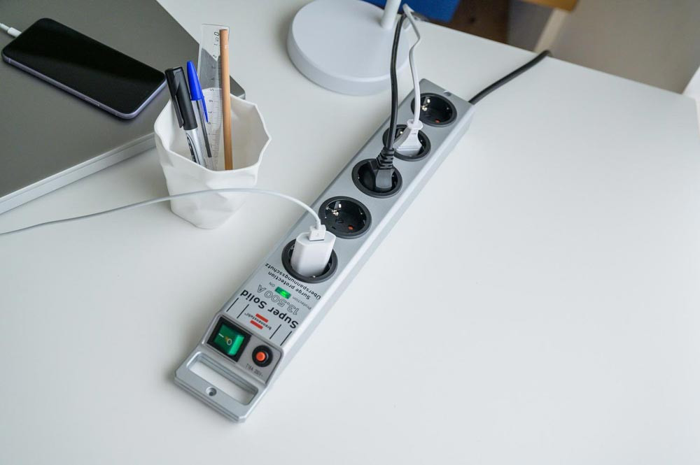 · Kabeleingang gegenüber dem Schalter, dadurch praktische Bedienung z.B. unter dem Schreibtisch