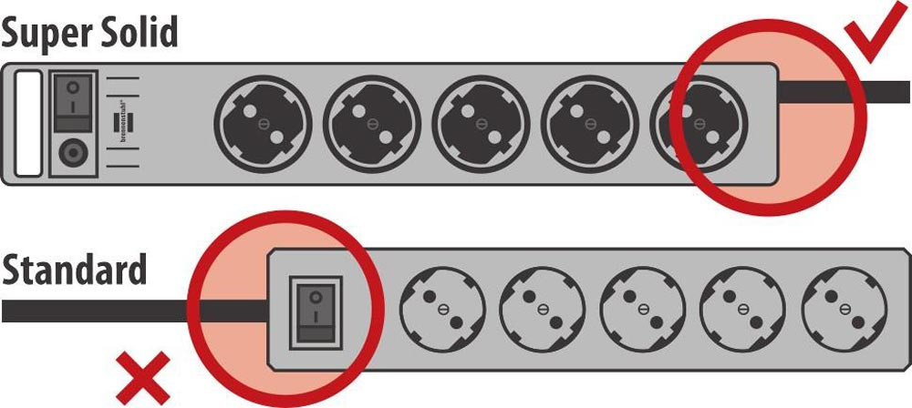 schützt wertvolle elektrische Geräte vor gefährlicher Überspannung · sehr stabil konstruierte Steckdosenleiste aus hochbruchfestem Polycarbonat · Sicherheitsschalter beleuchtet, 2-polig ein-/ausschaltbar · Schutzkontaktsteckdosen in 45°-Anordnung, auch für Winkelstecker · die Abstände ermöglichen den Betrieb von Netzgeräten · mit Aufhängevorrichtung, sehr gut anschraubbar durch Schraubführungen · mit Kinderschutz · Sichungsautomat 16 A · Länge der Steckdosenleiste = 45 cm