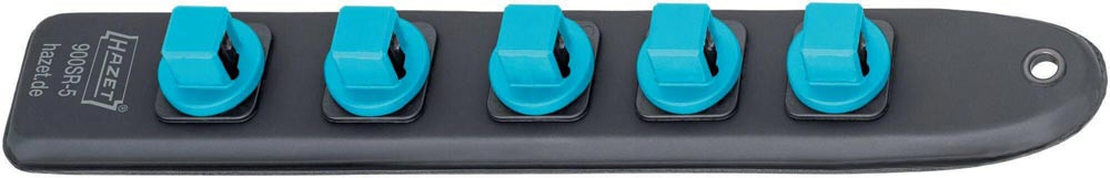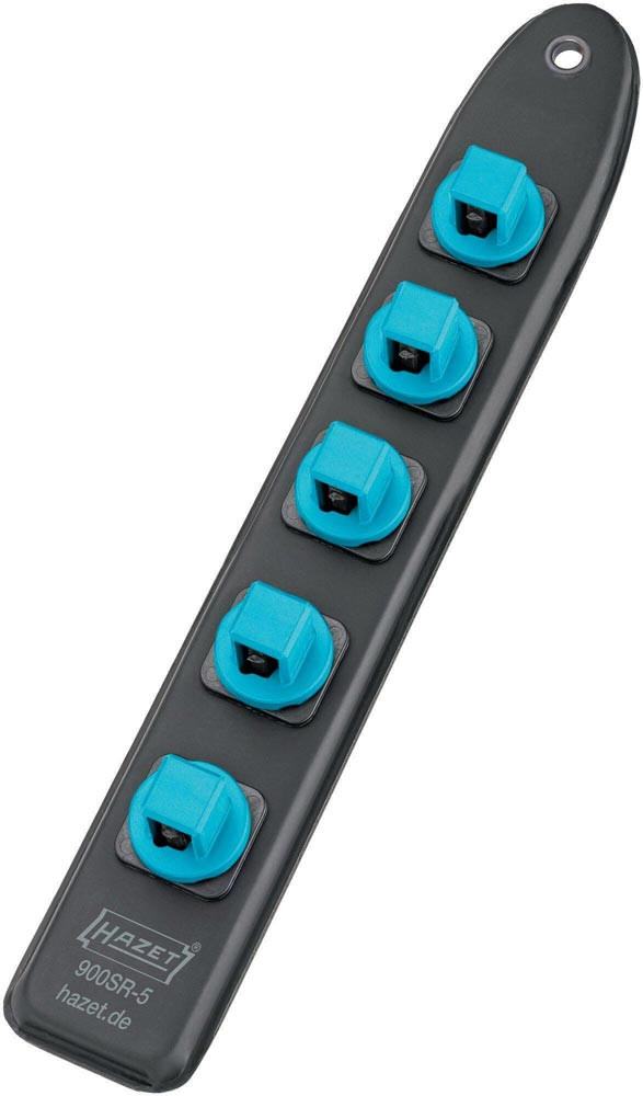 Anwendung: Flexible Kunststoff-Steckleiste mit 1⁄2″ Vierkantaufnahmen Magnetische Unterseite gewährleistet Halt auf allen eisenhaltigen Flächen · z.B. an Werkstattwagen · Werkzeugwänden · Maschinen · Hebebühnen und in Metallschubladen Leicht zu reinigen Langlebige · robuste Drehverriegelung für festen Sitz und sofortigen Zugriff Sicherer fixiert im arretierten Zustand: zur Entnahme Steckschlüsseleinsatz nach links drehen Robuster Metallöse zum Aufhängen · z.B. an einem Haken Antrieb: Vierkant hohl 12,5 mm (1/2 Zoll) · Modell 900SR-5