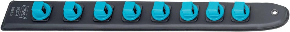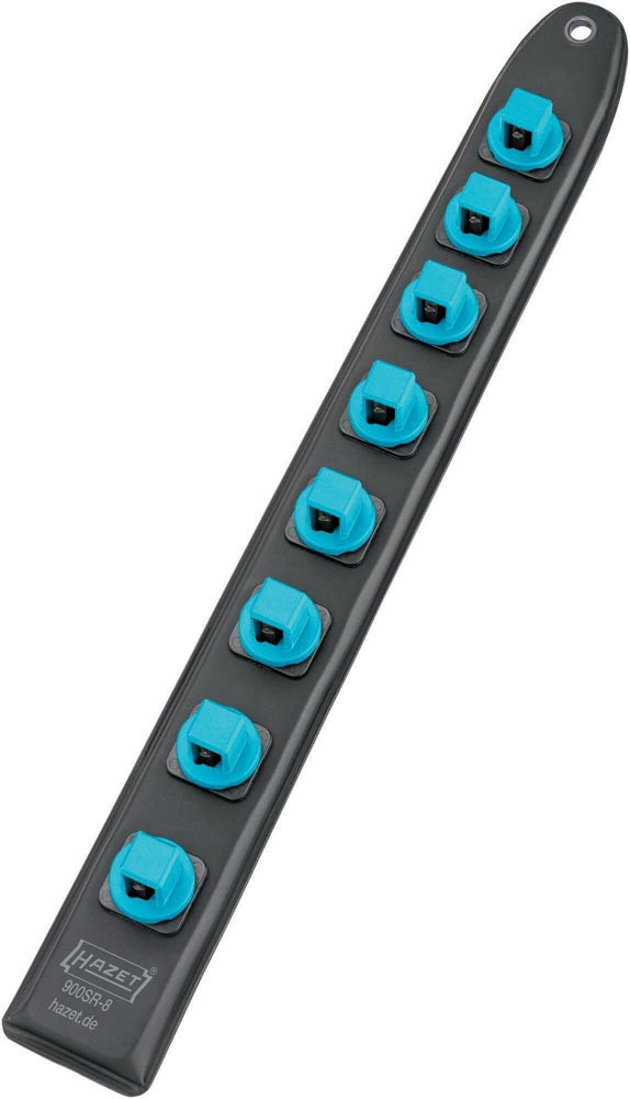 Anwendung: Flexible Kunststoff-Steckleiste mit 1⁄2″ Vierkantaufnahmen Magnetische Unterseite gewährleistet Halt auf allen eisenhaltigen Flächen · z.B. an Werkstattwagen · Werkzeugwänden · Maschinen · Hebebühnen und in Metallschubladen Leicht zu reinigen Langlebige · robuste Drehverriegelung für festen Sitz und sofortigen Zugriff Sicherer fixiert im arretierten Zustand: zur Entnahme Steckschlüsseleinsatz nach links drehen Robuster Metallöse zum Aufhängen · z.B. an einem Haken Antrieb: Vierkant hohl 12,5 mm (1/2 Zoll) · Modell 900SR-8