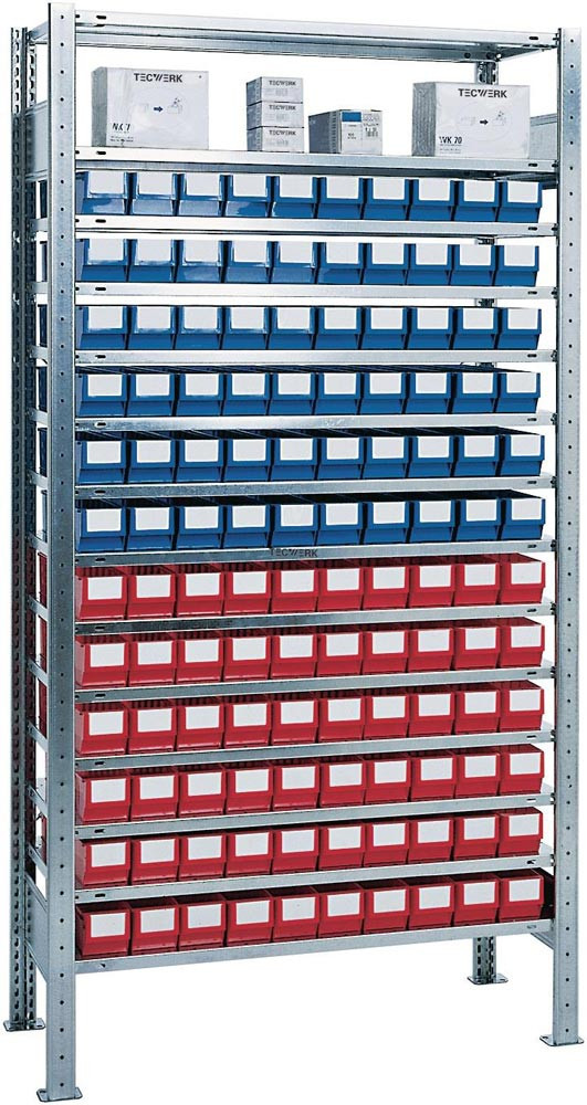 komplett mit TECWERK Lagerboxen und Sichtlagerkästen · einfache und schnelle Steckmontage mit vormontierten verzinkten Rahmen · Fachböden verzinkt mit verstärktem Kastenprofil, H 25 mm, höhenverstellbar im 25-mm-Raster · Tragfähigkeit pro Fachboden 150 kg · Feldlast 1300 kg