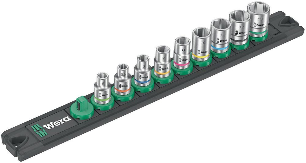 Nuss-Magnetleiste mit 9 Hand- und Maschinensteckschlüssel-Einsätzen (non-impact) · 1/4″. Ein leichtgängiger Drehmechanismus sorgt für einen sicheren Halt und leichte Entnahme der Nüsse. Mit Take it easy Werkzeugfinder mit Farbkennzeichnung nach Größen - zum einfachen und schnellen Finden des benötigten Werkzeugs. Die Magnetleiste ermöglicht die temporäre Anbringung an metallischen Oberflächen und verfügt dank der Twist to unlock Funktion über eine sichere Nussverriegelung und -entriegelung.