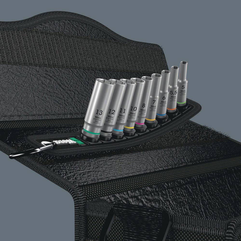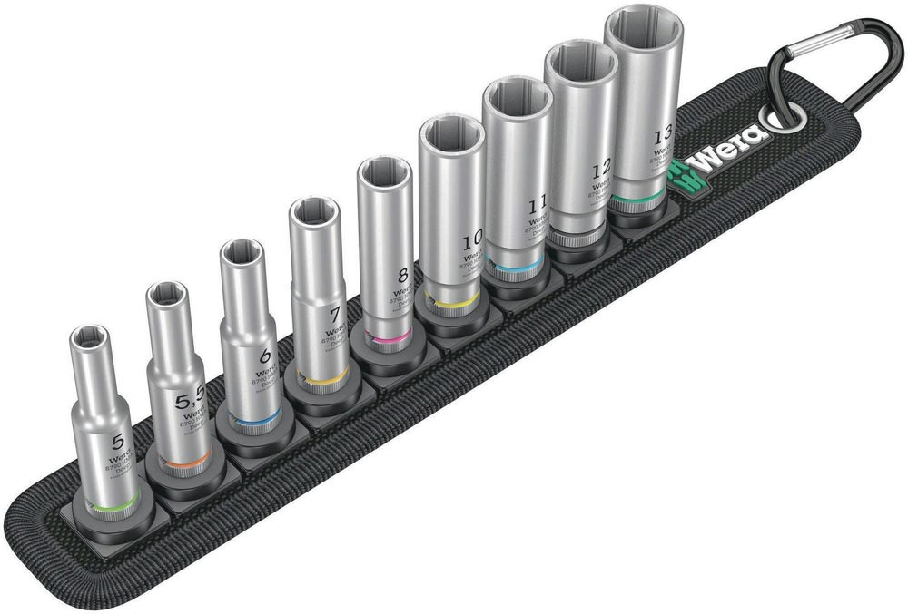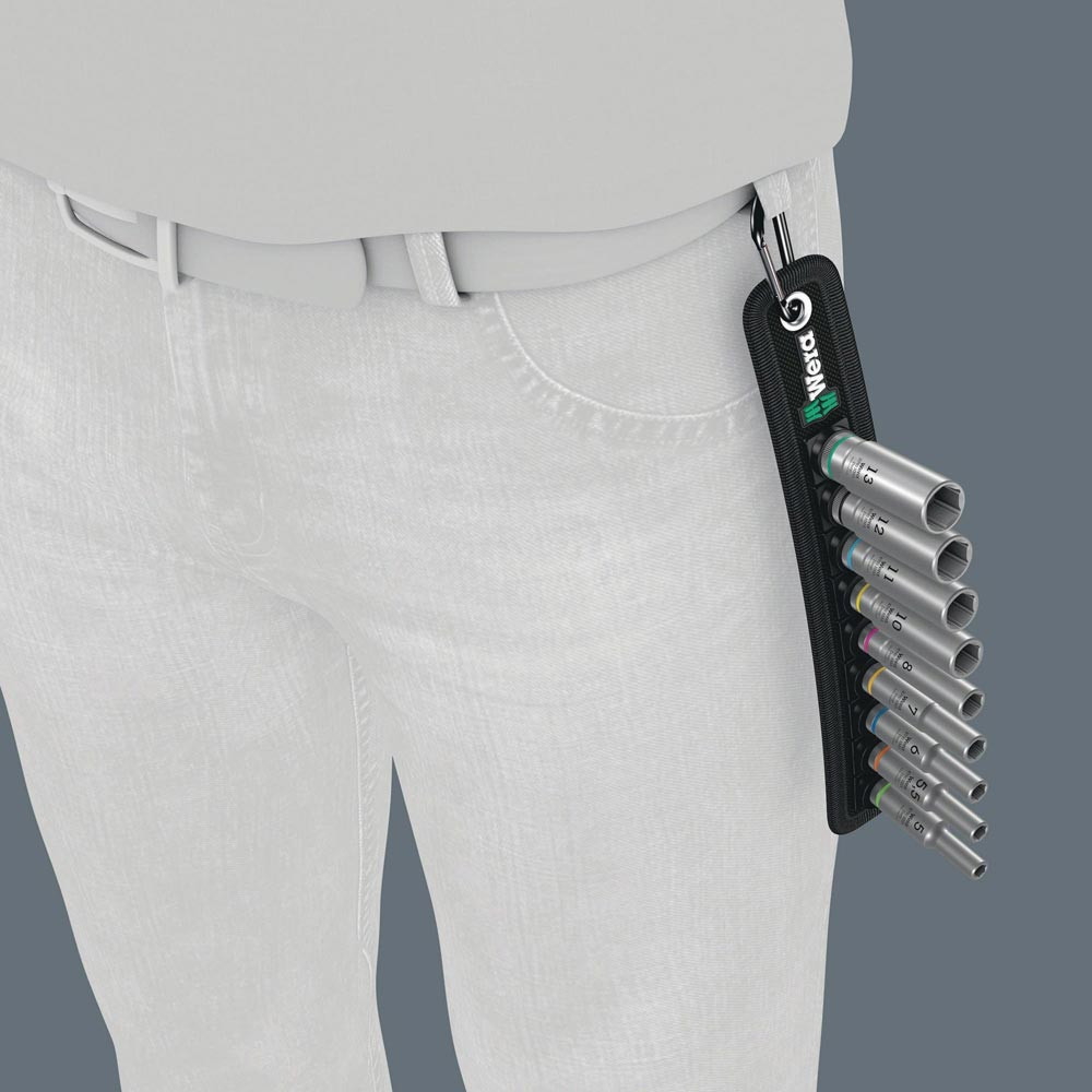robuster Textilgurt (Belt) im typischen Wera Design mit 9 langen 1/4″ Hand- und Maschinensteckschlüssel-Einsätzen (non-impact) auf engstem Raum · leichtgängiger Drehmechanismus sorgt für einen sicheren Halt und leichte Entnahme der Nüsse · inklusive Karabinerhaken zur Befestigung an Gürtelschlaufen oder Taschen · mit Vliesrücken und Klettklebestreifen zur einfachen Befestigung z.B. an Wand, Regal, Werkstattwagen und Wera 2go Werkzeugtransportsystem · lange 1/4″ Hand- und Maschinensteckschlüssel-Einsätze (ISO 2725-Teil 3) von Wera für den Einsatz im Hand- und Maschinenbetrieb (non impact) auch bei tiefliegenden Verschraubungen und überstehenden Gewindestangen · mit Take it easy Werkzeugfinder mit Farbkennzeichnung nach Größen - zum einfachen und schnellen Finden des benötigten Werkzeugs · griffig zum leichten Greifen auch mit öligen Händen · mit Sechskantprofil und Kugelfangrille · das Sechskantprofil ermöglicht die Übertragung hoher Kräfte und belastet die Kanten der Schraubenmutter bzw. des Schraubenkopfes weniger als ein Zwölfkantprofil · feinverzahnte Knarren machen darüber hinaus durch ihren kleinen Rückschwenkwinkel den Einsatz eines Zwölfkantprofils auch in beengten Raumverhältnissen überflüssig · für Außensechskantschrauben und -muttern